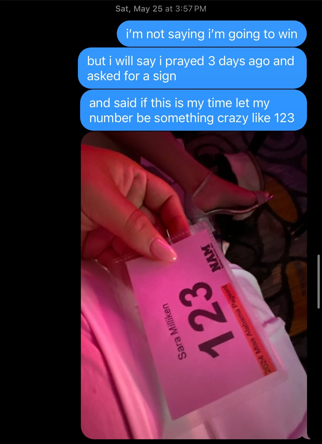 Peep the text sent to my dear friend Bethany on May 25- the day of check in. But God. I had all the peace I needed going into the weekend. It was him telling me this is your crown so go get it.